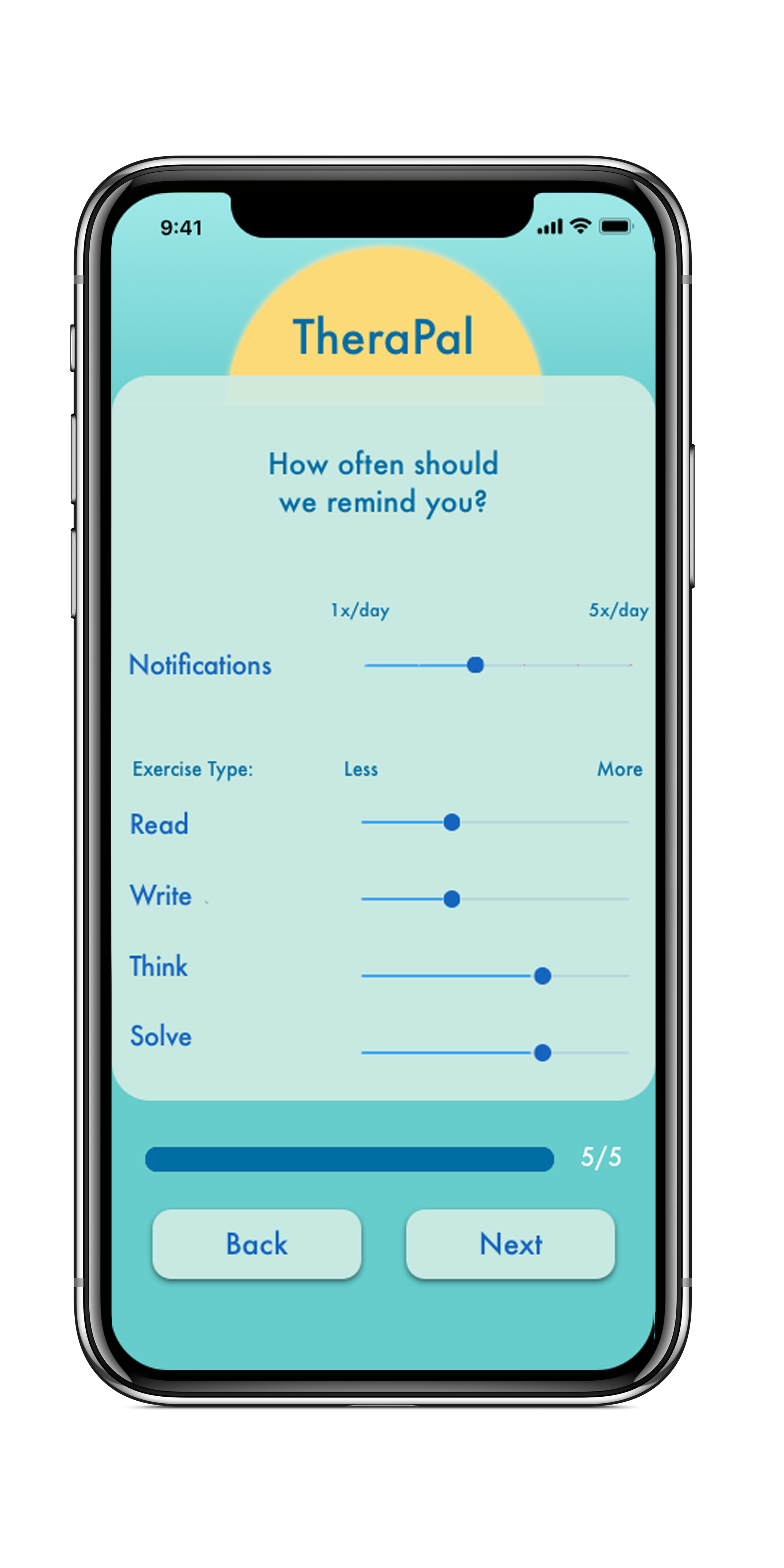 A notification system set up to your preference - reminding you throughout the day to practice positive theraputic exercises, thoughts and skills. creating new habits more efficiently.
